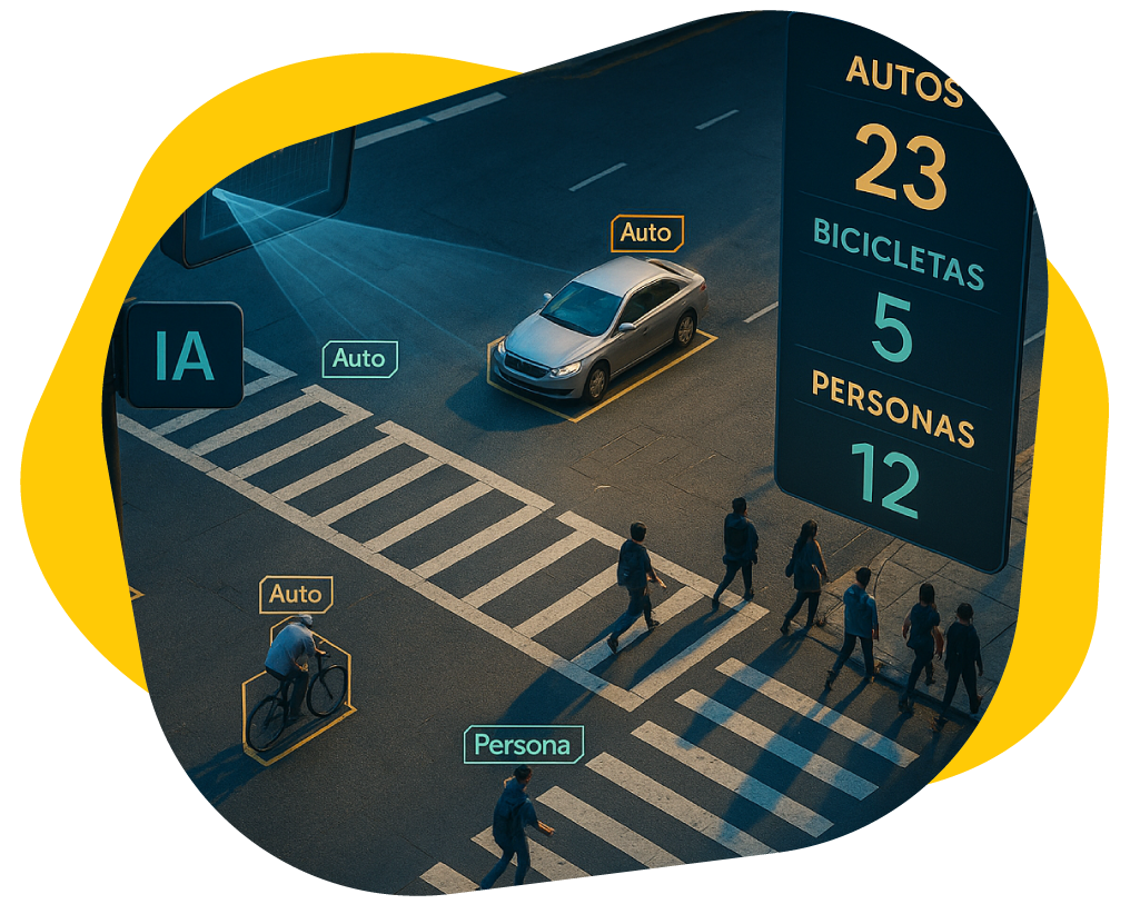 Contamos con tecnología de video-analítica basada en inteligencia artificial para realizar aforos vehiculares, ciclistas y peatonales con alta precisión y 100% automatizados.